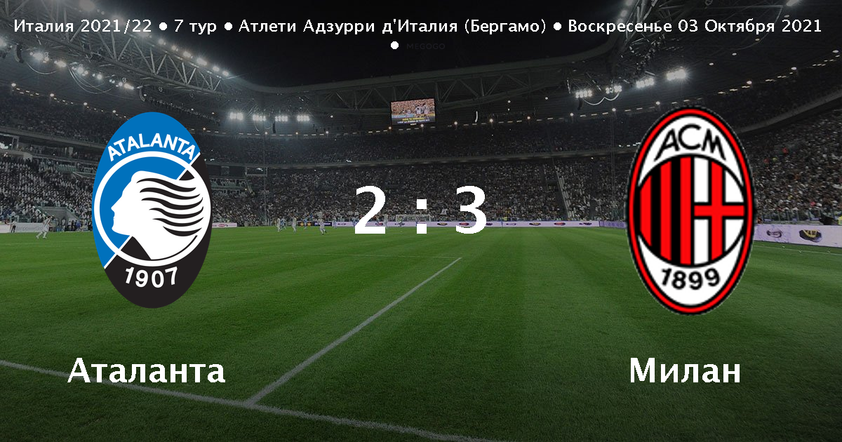 Прогноза за Аталанта - Милан и статистика за двата отбора от спортен сайт Евромач за мача от Италия Серия А на 03 октомври 2021. 11092021 Аталанта 12 Фиорентина 28082021 Аталанта 00 Болонья 21082021 Торино 12 Аталанта 14082021 Ювентус 31 Аталанта 11082021 Аталанта 71 Алессандрия 07082021 Вест Хэм 20 Аталанта 31072021 Аталанта 21 Порденоне 18072021 Аталанта 11 Maccabi Bnei Raina 16072021 Аталанта 130 Albinogandino 19052021 Аталанта 12.